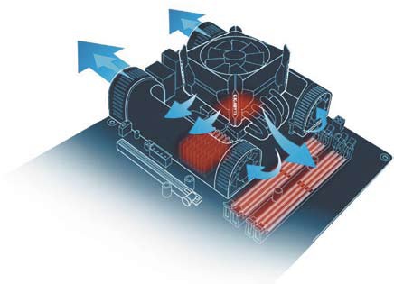 Рис. 2. Система охлаждения Turbojet и охлаждающие воздушные потоки Необходимо отметить, что перечисленными элементами не исчерпываются особенности материнских плат линейки GA-G1975X. Их отличительной чертой является также возможность одновременного применения двух видеоадаптеров, используемых в режиме SLI. Эти видеоадаптеры подключаются посредством двух слотов стандарта PCI Express x16, поддерживающих режимы PCI Express x8 (рис. 3). А для расширения компьютерной системы используются два слота PCI и два PCI Express x4.