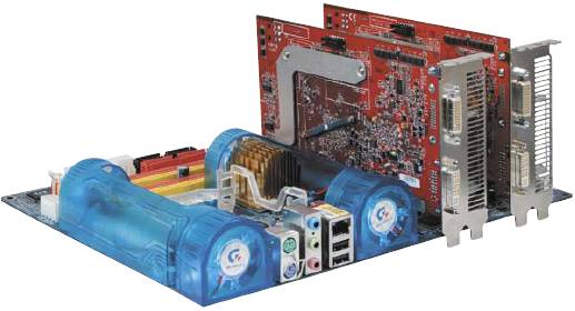 Рис. 3. Материнская плата Gigabyte GA-G1975X с двумя видеоадаптерами В качестве аудиокодека в составе материнских плат линейки GAG1975X использована микросхема Creative CA0106-DAT. Реализовано восемь аудиоканалов (7.1), обеспечивающих сравнительно высокое качество: в полосе 40–15 кГц неравномерность АЧХ составляет менее 0,15 дБ, динамический диапазон — около 85 дБ, гармонические искажения — менее 0,01%. Традиционный сетевой контроллер Gigabit Ethernet реализован на микросхеме Broadcom 5789, подключенной через шину PCI Express х1. Новые платы — благодаря поддержке компоненты чипсета ICH7R — имеют в своем составе четыре порта Serial ATA 300 и один порт Parallel ATA-100. Микросхема ICH7R предоставляет возможность на основе накопителей Serial ATA реализовать функции RAID 0, RAID 1, RAID 0+1, RAID 5. Дополнительная микросхема ITE IT8211F обеспечивает работу Parallel ATA IDE с поддержкой протоколов UltraDMA 133/100/66. Хотя указанные материнские платы и обеспечивают высокий уровень производительности всех входящих в их состав систем, конструкторы предусмотрели средства разгона, позволяющие повысить производительность ПК за счет увеличения тактовых частот основных подсистем. Этому способствует фирменная утилита EasyTune 5, обеспечивающая мониторинг и настройку системных параметров в реальном времени. Кроме того, материнская плата поддерживает целый ряд эксклюзивных разработок Gigabyte. Среди них Dual BIOS — технология резервного хранения программного кода BIOS в дополнительной микросхеме, что обеспечивает повышенную надежность при выполнении операции модификации кода, а также в случае вирусных атак. Так же поддерживается CIA (CPU Intelligent Accelerator) 2 — динамическое изменение частоты процессорной шины, а следовательно, и процессора (в зависимости от его текущей загрузки, определяемой характером выполняемых задач). Технология MIB (Memory Intelligent Booster) 2 позволяет повысить производительность (декларируется до 10 %) подсистемы оперативной памяти за счет сокращения задержек без снижения стабильности. ПроизводительностьКонфигурация системы, используемой в тестировании: