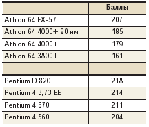 В общей оценке Pentium D 820 эффект от его второго ядра примерно эквивалентен прибавке частоты в 400 МГц для одноядерного процессора. То есть по производительности он примерно равен 3,2 ГГц процессору Pentium 4 540J. Не очень убедительно в общем зачете выглядит Pentium 4 670, работающей на новой 955X материнке с памятью DDR2-667. Его производительность практически равна таковой у Pentium 4 560 (925X чипсет с памятью DDR2-533). SYSmark2004: Internet Content CreationВ этой дисциплине лидируют, прежде всего, процессоры с быстрыми блоками FPU. Кроме того, участвующие в этом подтесте приложения активно используют набор команд SSE2 и многопоточную обработку. В состав теста входят Macromedia Dreamweaver и Flash MX, Discreet 3ds max 5.1, Adobe AfterEffects 5.5, Photoshop 7.0.1 и Premiere 6.5, Microsofts Windows Media Encoder 9, WinZip 8.1 а также McAfee VirusScan 7.0.