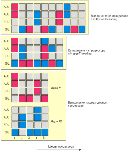 Многоядерность — следующий этап развитияИзбежать конфликтных ситуаций, возникающих при использовании технологии Hyper-Threading, можно в том случае, если изолировать в пределах одного процессора выполнение различных потоков инструкций. Фактически для этого потребуется использовать не одно, а два и более ядер процессора. Тогда в идеальном варианте каждый поток инструкций утилизирует отведённое ему ядро процессора (и исполнительные блоки), что позволяет избежать конфликтных ситуаций и увеличить производительность процессора за счёт параллельного выполнения потоков инструкций. В рассмотренном примере возникновения конфликтных ситуаций при использовании технологии Hyper-Threading применение двух независимых ядер для выполнения двух потоков инструкций позволило бы выполнить весь программный код не за семь (как в случае процессора с технологией Hyper-Threading), а за пять тактов (рис. 4).