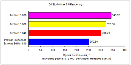 Рисунок 10. Результаты тестирования в пакете 3ds Studio Max 7.0 Поиск золотой серединыИтак, давайте попробуем обобщить результаты тестирования двухъядерных процессоров Intel. В отношении технологии Hyper-Threading, реализованной в процессоре Intel Pentium Processor Extreme Edition, всё предельно ясно: вреда от неё больше чем пользы. Впрочем, вряд ли пользователю придётся рассуждать на тему блокировать или не блокировать данную технологию в BIOS, поскольку, как мы уже отмечали, данный процессор просто нельзя купить. Поэтому остаётся сделать выбор между тремя моделями. Если речь идёт о компьютере на базе двухъядерного процессора, который должен обладать максимальной производительностью, то выбор однозначен – это процессор Intel Pentium D 840. Однако сказать, что этот процессор оптимален, нельзя. Действительно, всё бы хорошо, но стоимость! А если при этом учесть, что в сравнении с процессором Intel Pentium D 820 прирост производительности в среднем составляет 10%, а стоимость отличается на 115%, то, согласитесь, есть о чём призадуматься. Если же сравнивать друг с другом процессоры Intel Pentium D 830 и Intel Pentium D 820, то окажется, что при усреднённой разнице в производительности на 5% их стоимость отличается всего на 30%. Согласитесь, что пара 5% и 30% куда лучше пары 10% и 115%. Поэтому, если говорить об оптимальности, то выбор, конечно, следует делать между процессорами Intel Pentium D 830 и Intel Pentium D 820. И прежде чем вынести наш окончательный вердикт, напомним, что кроме производительности и стоимости эти два процессора отличаются ещё и тем, что модель Intel Pentium D 830 поддерживает технологию Intel Speed Step, а модель Intel Pentium D 820 – нет. Что это означает с точки зрения пользователя? Да хотя бы то, что данная технология снижает энергопотребление процессора Intel Pentium D 830 и позволяет, тем самым, создавать на его основе малошумные ПК. Впрочем, нужно отметить, что даже с использованием технологии Intel Speed Step энергопотребление процессора Intel Pentium D 830 остаётся выше, чем энергопотребление процессора Intel Pentium D 820. Дело в том, что технология Intel Speed Step позволяет снижать тактовую частоту и напряжение питания процессора в периоды его слабой активности, но до тех значений, которые являются штатными для Intel Pentium D 820. Что ж, это действительно так, но… Есть одно маленькое «но». Дело в том (только это по большому секрету), что двухъядерные процессоры семейства Intel Pentium D очень хорошо разгоняются. Ничего не мешает путём разгона и процессор Intel Pentium D 820, и Intel Pentium D 830 превратить в модель Intel Pentium D 840. А вот Intel Pentium D 840 гнать тяжело. То есть разогнать можно (проблем нет), но вот охлаждать его крайне проблематично. Так вот, именно при разгоне процессоров технология Intel Speed Step, которой нет у процессора Intel Pentium D 820, как раз и окажется крайне востребованной, поскольку именно эта технология, за счёт снижения тактовой частоты и напряжения питания процессора в те моменты, когда он малоактивен, позволяет снизить требования к эффективности системы теплоотвода и создавать не только высокопроизводительные, но и малошумные ПК. Итак, наш окончательный вердикт таков: наилучшим выбором для пользователей среди семейства двухъядерных процессоров Intel является процессор Intel Pentium D 830. При умеренной цене этот процессор обладает производительностью, сопоставимой с производительностью старшей модели (Intel Pentium D 840), легко разгоняется, а главное – обладает всем набором технологий, которые позв