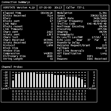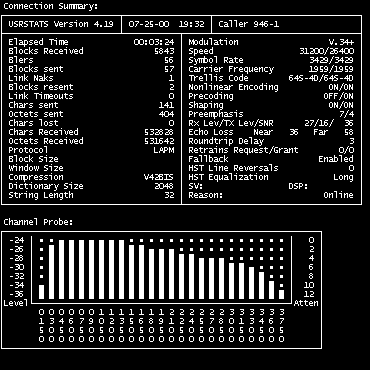 Помимо стандартных команд обработки статистики для модемов 3Com/U.S.Robotics, в прошивке 56k Message Modem имелась поддержка спецификации Unimodem Diagnostics Command - директива AT#UD, расшифровав статистику выдаваемой по этой команде с помощью специальной утилиты, которую можно взять отсюда, становится возможным узнать начальную и конечную битовую скорость.
