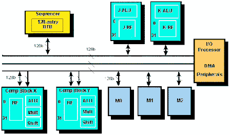 Универсальное АЛУ процессора, устройство барабанного сдвига и универсальный умножитель функционируют независимо, обеспечивая высокую степень внутреннего параллелизма операций. Регистровый файл общего назначения служит для обмена данными между вычислительными модулями и внутренней шиной, а также для запоминания промежуточных результатов. Регистровый файл содержит 32 регистра (16 - первичных и 16 - вторичных), имеет 10 портов и, совместно с Гарвардской архитектурой процессора, позволяет организовывать эффективный обмен между вычислительными модулями и памятью. Расширенная Гарвардская архитектура процессора позволяет выбирать до двух операндов и команду из кэша команд за один цикл.