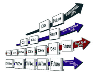 Сигнальные процессоры компании Texas Instruments [8] разделяются на два класса: это процессоры для обработки чисел с фиксированной точкой и процессоры для обработки чисел с плавающей точкой (рис.4.). Первый класс представлен тремя семействами процессоров, базовыми моделями которых являются соответственно TMS320C10, TMS320C20, TMS320C50. Второй класс включает процессоры TMS320C30, TMS320C40, TMS320C80, которые поддерживают операции с плавающей точкой и представляют собой мультипроцессорную систему выполненную на одном кристалле, а семейство TMS320C6x включает как процессоры с фиксированной, так и с плавающей точкой.