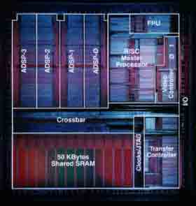 Процессор TMS320C80 фирмы Texas Instruments с производительностью в 2 млрд. операций в секунду представляет собой комбинацию из пяти процессоров, реализованных по MIMD (multiple-instruction, multiple-data) архитектуре (рис.5.). На одном кристалле реализованы одновременно две технологии - DSP и RISC, расположены один управляющий RISC процессор и четыре 32-х разрядных цифровых сигнальных процессора усовершенствованной архитектуры с фиксированной точкой (ADSP0-ADSP-3), обладающие высокой степенью конвейеризации и повышенной до 64 бит длиной слова инструкций, а это в свою очередь позволяет описывать сразу несколько параллельно выполняемых команд. Каждый из процессоров работает независимо друг от друга и может программироваться отдельно друг от друга и выполнять различные или одинаковые задачи, обмениваясь данными через общую внутрикристалльную кеш-память.