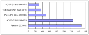 Компания Analog Devices [7] ведет разработки в обоих направлениях. Так ядро первого 32-разрядного процессора ADSP-21020 и производительностью 30 MFLOPS было усовершенствовано, что привело к созданию нового процессора ADSP-21065L с максимальной производительностью 198 MFLOPS, что соответствует ускорению в 6.6 раз. Работая над дальнейшим увеличением производительности, оптимизируя архитектуру существующих процессоров, был разработан новый сигнальный микропроцессор ADSP-2116x с тактовой частотой 100 МГц производительностью 600 MFLOPS.