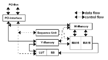 Рис.20. Структурная схема Synapse 2 Серийно выпускаемые нейроускорители "Синапс-3" поставляются с двумя процессорами МА 16. Пиковая эффективность одной нейроплаты Synaps3 - 2.4 млрд.операций/сек. Программное обеспечение работает в среде UNIX/XWIND и реализовано на C++. Нейронная сеть тоже описывается на С++ или может вводится интерактивно с помощью графического интерфейса типа OSF/Motif, что позволяет визуализировать конфигурацию СБИС после отображения на нее структуры сети. Средства тестирования и эмуляции развиты очень хорошо.