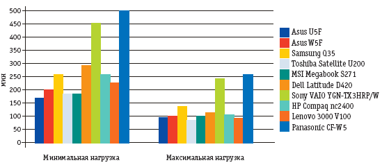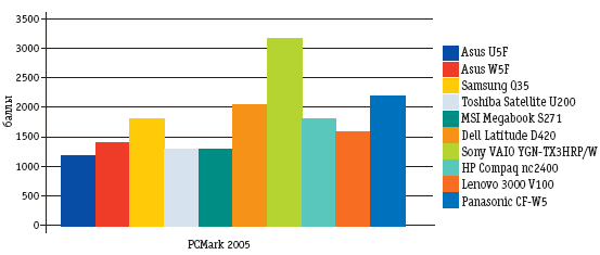 В новинке используется ULV-процессор Intel Core Solo модели U1400 с частотой 1,2 ГГц, 512 Мбайт оперативной памяти, жесткий диск емкостью 60 Гбайт. Экран диагональю 12,1 дюйма. При весе 1240 г ноутбук оснащен встроенным оптическим приводом. Что касается внешнего вида, модель выполнена в металлическом корпусе серебристого цвета, внутренняя поверхность ребристая, что вкупе с круглой сенсорной панелью добавляет определенную оригинальность. Кроме того, благодаря конусовидной форме корпуса при установке CFW5 на стол клавиатура получает дополнительный наклон, что повышает удобство работы. CF-W5 ориентирован в первую очередь на бизнес-пользователей, особенно на тех, кто очень часто ездит в командировки или должен по долгу службы перемещаться из офиса в офис. В данной модели, помимо защиты жесткого диска от вибраций и ударов (падение с 10 см в работающем состоянии, и до 76 см в неработающем), предусмотрена защита самого ноутбука от сдавливания. В частности, он выдерживает усилие 100 кг, приложенное к верхней и нижней поверхности. Поэтому для его транспортировки не нужны специальные сумки — ПК можно спокойно переносить в обычной матерчатой сумке. От стандартной батареи ноутбук проработал более 10 часов, что близко к заявленному производителем (11 часов). Отметим это время как лучшее среди всех участников теста. Розничная цена CF-W5 в России составляет около $2900, что довольно традиционно для защищенных устройств вендора. ВыводыВыделить явного лидера среди рассмотренных ноутбуков достаточно сложно, технологически первое место занимают ноутбуки Sony и Panasonic, однако сравнительно высокая цена никогда не позволит им стать столь же массовым и популярным решением, как более сбалансированные ноутбуки ASUS или HP. В то же время, если руководствоваться исключительно ценой, модель MSI становится одной из наиболее привлекательных, несмотря на несколько меньшую, чем у конкурентов, производительность. Компания Samsung кардинально изменила направленность своей Q-серии: если раньше это были одни из наиболее легких ноутбуков, то теперь покупателю предлагается длительное время автономной работы вкупе с компактными размерами. Иным путем пошла Dell, отказавшись от идеи интеграции оптического привода в ноутбук, посчитав, что он вряд ли пригодится большинству пользователей ежедневно (с чем сложно не согласиться). И наконец, компании Toshiba и Lenovo борются за покупателей, внедряя функциональные возможности, присущие бизнес-ноутбукам.