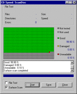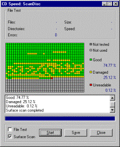 Болванка от Verbatim (слева), прожженная на TEAC 552E, демонстрирует высочайшее качество записи, идеально подходящее для режима MODE 2. Болванка от безымянного производителя (справа), прожженная на том же самом приводе, обнаруживает большое количество разрушенных секторов и для записи в MODE 2 не пригодна. |