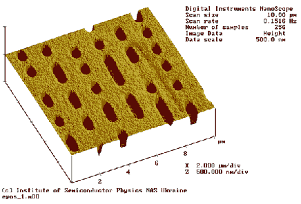 Рисунок 2 Поверхность лазерного диска под электронным микроскопом. Видны чередующиеся цепочки углублений – "питов" (от английского pit – ямка, впадина) и возвышенностей – "лендов" (от английского land – равнина, земля). Ленды отражают большую часть падающего на них света лазерного излучателя, а питы в силу своей удаленности от точки фокуса не отражают практически ничего (рисунок взят с сайта фирмы EPOS).