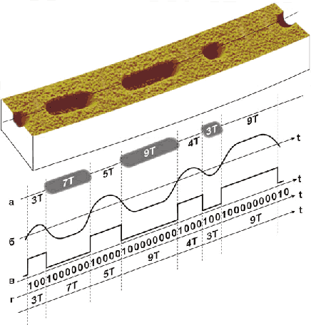 Рисунок 3 "Питы" и "ленды" образуют цепочки с длиной от трех до десяти "питов" ("лендов") каждая. Переход от "пита" к "ленду" (или наоборот) соответствует логической единице, а логический нуль представляется отсутствуем переходов в данном месте. Поскольку диаметр сфокусированного лазерного пятна равен трем "питам", более короткие цепочки уже не распознаются лазером, а ограничение длины цепочек сверху обусловлено степенью точности тактового генератора и равномерностью вращения диска. В самом деле, если точность такового генератора составляет порядка 10%, то при измерении 10-питовой цепочки мы получаем погрешность в ±1 пит (рисунок взят с сайта фирмы EPOS). Некоторые производители уменьшают длину одного "пита" на 30%, что во столько же раз увеличивает эффективную емкость диска. Возникает вопрос: как же в таком случае привод ухитряется определить длину той или иной цепочки? Ведь в отсутствие каких бы то ни было опорных значений, провод вынужден сравнивать длину "питов" со стандартным эталоном, а это значит, что цепочка из N уплотненных "питов" будет интерпретирована как N/2! Дизассемблировав прошивку своего PHILIPS'a, автор выяснил, что привод имеет автоматический регулятор скорости, подбирающий такое значение T, которое соответствовало бы наименьшему количеству ошибок чтения.