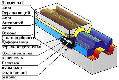 Рисунок 4 На CD-R дисках никаких "питов" в прямом смысле этого слова нет, но их заменяет специальный слой прожигаемого красителя, деформирующего отражающий слой и препятствующий отражению лазерного луча в данном месте. Однако с точки зрения CD-ROM привода, штампованные и CD-R диски выглядят практически одинаково, за тем исключением, что штампованные диски более контрастны (рисунок взят с сайта фирмы EPOS). ПроблемыСам по себе MODE 2 никаких сложностей не вызывает. Это стандартный режим, штатно поддерживаемый всеми приводами, носителями и драйверами. Проблема в том, что праматерь ISO9660 и все ее потомство налагает на размер сектора жесткие ограничения, требуя чтобы он представлял собой степень двойки (т. е. равнялся 512, 1024, 2048, 4096… байтам). Размер пользовательской области данных сектора, записанного в MODE 1, удовлетворяет этому требованию (211 = 2048), а MODE 2 – нет, и в конце сектора остается "хвост" из 288 неиспользуемых байт (211 + 288= 2336). Программы профессионального "прожига" позволяют записывать диск как в XA MODE 2 FORM 1, так и в XA MODE 2 FORM 2, однако это ни на йоту не увеличивает его объема, поскольку хвостовая часть секторов, записанных в FORM 2, вынуждена пустовать, снижая надежность хранения данных и ничего не давая взамен. Теоретически возможно создать драйвер, транслирующий n MODE 2 секторов в k*n MODE 1 секторов (и такой драйвер действительно был создан настоящим автором), однако целесообразность его использования весьма сомнительна, поскольку далеко не каждый пользователь согласится устанавливать в свою систему "кустарный" драйвер – ошибки драйверов зачастую обходятся очень дорого (вплоть до потери всех данных на жестком диске), а программисты, как и все люди в этом мире, склонны ошибаться. Так или иначе, от идеи использования драйвера автор отказался, поскольку его тестирование выглядело слишком масштабным проектом. Немногим лучше обстоят дела и с Video CD/Super Video CD. На первый взгляд кажется: ну какие тут могут быть проблемы? Берем Ahead Nero Burning ROM, в меню диалогового окна "New Compilation" выбираем Video CDи… диск действительно записывается, но только в MPEG1. Формат Super Video CD в свою очередь соответствует MPEG2. Никакого обмана здесь нет, – вы получаете 800/900 Мб настоящего MPEG1/MPEG2, что на 100 Мб превосходит емкость стандартного CD-R. В то же время использование DivX (MPEG4) дает значительно больший выигрыш в емкости, сжимая два Video CD в один CD-ROM. Но что нам мешает записать в формате Video CD тот же самый MPEG4 или MP3? Увы, не все так просто! Большинство программ записи (и Ahead Nero Burning ROM в том числе) осуществляют тщательную проверку всего записываемого на диск и, столкнувшись с MPEG-4, либо насильно перекодируют его в MPEG1/MPEG2, либо вообще отказываются от записи. Мотивация этого такова – Video CD должен соответствовать Стандарту, иначе это не Video CD. Действительно, автономные Video-плееры поддерживают диски строго определенных типов и на декодирование MPEG4 у них не хватит ни ума, ни аппаратной мощности. Персональный компьютер – другое дело. При наличии соответствующих кодеков, он воспроизведет любой мультимедийный формат, независимо от того: каким способом тот будет записан. Но даже если волшебным образом "отучить" Ahead Nero Burning ROM задавать лишние вопросы и заставить его записывать MPEG4/MPEG4 как Video CD, это ни к чему не приведет, поскольку операционные системы семейства Windows "поддерживают" Video CD диски весьма извращенным образом. "Сырой" видео