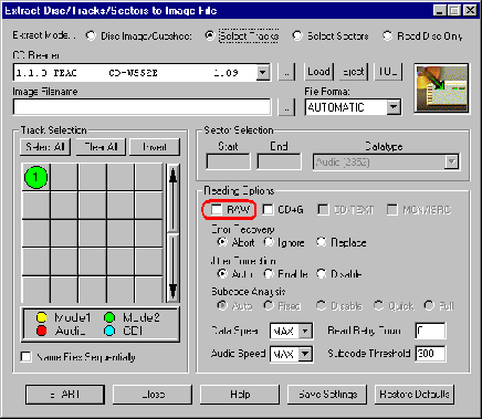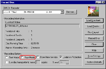 Рисунок 6 Запись 800/900 Мб диска в режиме MODE 2 средствами CDRWin. Исходные данные могут быть представлены в любом формате, однако штатными средствами операционной системы такой диск не поддерживается. Однако попытка просмотра оглавления только что записанного диска штатными средствами операционной системы ни к чему хорошему не приводит: нас пытаются убедить в том, что данный диск пуст. Но ведь это не так! Запускаем CDRWin, выбираем "Extract Disc/Tracks/Sectors" и в окне "Track Selection" видим наш трек TRACK 1 собственной персоной. Хотите его проиграть? Легким движением мыши перемещаем "Extractmode…" в "SelectTrack", а в "ReadingOptions" сбрасываем галочку "RAW" (если этого не сделать, содержимое трека будет читаться в сыром режиме, перемежевывая полезные данные вместе с заголовками, что никак не входит в наши планы). Выбираем трек, который мы будем извлекать и, выбрав номинальную скорость чтения, нажимаем на "START" (чтение MODE 2-трека на максимальной скорости зачастую приводит к многочисленным ошибкам).