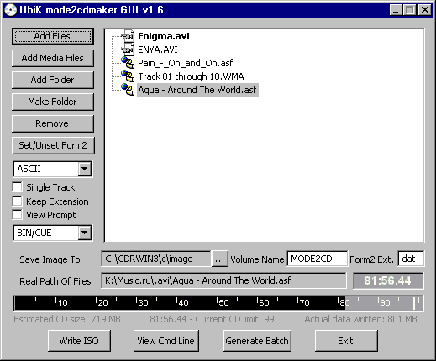 Рисунок 7 Чтение диска, записанного в MODE 2 средствами CDRWin путем предварительного копирования одного или нескольких треков на винчестер. Вернув файлу его законное расширение (которое рекомендуется записывать на коробке диска фломастером, т. к. в процессе записи оно необратимо теряется), запускаем "Универсальный Проигрыватель" (или любой другой аудио/видео плеер по вашему вкусу) и расслабляемся в свое удовольствие. При желании процесс грабежа файла можно автоматизировать, воспользовавшись утилитой SNAPSHOT.EXE из пакета консольной версии программы CDRWin. Используя утилиту MAKEISO.EXE, поставляемую вместе с CDRWin, создайте один легальный трек, записанный в формате MODE 1/ISO9660 и содержащий командный файл для автоматического извлечения выбранного пользователем MODE 2-трека. Подробности этого процесса вы найдете в документации на CDRWin. Минимальные навыки программирования вам также не помешают. Сеанс практической магии в Video CDДля записи DivX/MP3 файлов в формате Video CD нам понадобиться утилита MODE 2 CD MAKER, бесплатную копию которой можно найти здесь: http://peque.homeftp.org/~dext/xcd/mode2cdmaker-1.5.1.zip. Если командная строка вызывает у вас уныние (а MODE 2 CD MAKER – это утилита командной строки), воспользуйтесь специальной графической оболочкой, загружаемой отсюда http://peque.homeftp.org/~dext/xcd/m2cdmgui16.zip. Интерфейс программы прост и вполне традиционен: вы перетаскивайте мышкой записываемые файлы в большое белое окно (или нажимаете на "Add Files"), внизу которого отображается индикатор-змейка, показывающий использованный объем. По умолчанию программа закладывается на MODE 2 FORM 1 (2048 байт на сектор) и для перехода на MODE 2 FORM 2 (2324 байта на сектор) необходимо кликнуть по кнопке "Set/Unset Form 2". Другое вредное умолчание – размещать каждый файл в "своем" треке – отключается установкой галочки напротив пункта "Single Track". Дело в том, что на создание одного трека расходуется порядка 700 Кб дискового пространства и раздельная запись большого количества файлов становиться попросту невыгодна (правда, диск, записанный в Single track-mode, не поддерживается операционной системой Linux). Наконец, когда все приготовления завершены, вы нажимаете "Write ISO" и через некоторое время спустя на диске образуется CUE-образ, для прожига которого можно воспользоваться все тем же CDRWin или Alcohol/Clone CD, – но это уже на любителя.