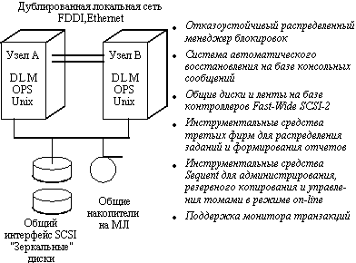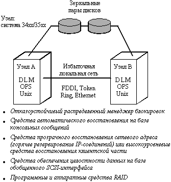 памяти и каналов "память-память" Компания DEC выпускает RAID массивы StorageWorks, которые поддерживают RAID уровней 0, 1 и 5 и обеспечивают замену компонентов без выключения питания. В стоечной конфигурации поддерживается до 70 накопителей и дополнительные источники питания. Они могут выполнять до 400 операций ввода/вывода в секунду и подключаются к основным компьютерам через интерфейс Differential Fast SCSI-2. Скоростью интерфейса составляет 10 Мбайт/с, максимальная длина связи - 25 м. UNIX-кластеры компании IBMКомпания IBM предлагает несколько типов слабо связанных систем на базе RS/6000, объединенных в кластеры и работающих под управлением программного продукта High-Availability Clastered Multiprocessor/6000 (HACMP/6000). В этих системах поддерживаются три режима автоматического восстановления системы после отказа: Режим 1 - в конфигурации с двумя системами, одна из которых является основной, а другая находится в горячем резерве, в случае отказа обеспечивает автоматическое переключение с основной системы на резервную. Режим 2 - в той же двухмашинной конфигурации позволяет резервному процессору обрабатывать некритичные приложения, выполнение которых в случае отказа основной системы можно либо прекратить совсем, либо продолжать их обработку в режиме деградации. Режим 3 - можно действительно назвать кластерным решением, поскольку системы в этом режиме работают параллельно, разделяя доступ к логическим и физическим ресурсам пользуясь возможностями менеджера блокировок, входящего в состав HACMP/6000. Начиная с объявления в 1991 году продукт HACMP/6000 постоянно развивался. В его состав были включены параллельный менеджер ресурсов, распределенный менеджер блокировок и параллельный менеджер логических томов, причем последний обеспечил возможность балансировки загрузки на уровне всего кластера. Максимальное количество узлов в кластере возросло до восьми. В настоящее время в составе кластера появились узлы с симметричной многопроцессорной обработкой, построенные по технологии Data Crossbar Switch, обеспечивающей линейный рост производительности с увеличением числа процессоров. Первоначально обязательным требованием режима 3 было использование высокопроизводительной дисковой подсистемы IBM 9333, которая использовала последовательный дисковый интерфейс с поддержкой 17.6 Гбайт дискового пространства, а также дисковой подсистемы IBM 9334 с интерфейсом SCSI, обеспечивающим дисковое пространство в 8.2 Гбайт. В августе 1993 года была анонсирована первая подсистема RAID: две модели 7135 RAIDiant Array могут поддерживать до 768 Гбайт дискового пространства в стоечной конструкции серии 900 и 96 Гбайт в напольных тумбовых конструкциях, при этом реализуют RAID уровней 1, 3 и 5. Кластеры RS/6000 строятся на базе локальных сетей Ethernet, Token Ring или FDDI и могут быть сконфигурированы различными способами с точки зрения обеспечения повышенной надежности: