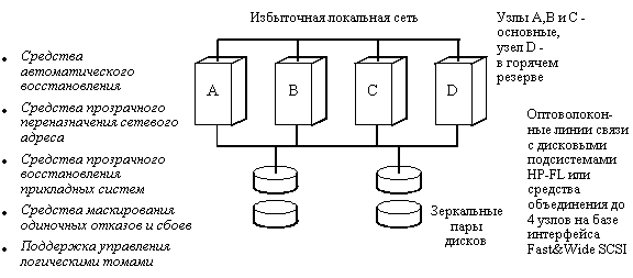 ![]() Рис. 11.4. Архитектура двухмашинного кластера SE90 компании Sequent Компания Sequent одной из первых освоила технологию Fast-Wide SCSI, что позволило ей добиться значительного увеличения производительности систем при обработке транзакций. Компания поддерживает дисковые подсистемы RAID уровней 1, 3 и 5. Кроме того она предлагает в качестве разделяемого ресурса ленточные накопители SCSI. Модель SE90 поддерживает кластеры, в состав которых могут входить два, три или четыре узла, представляющих собой многопроцессорные системы Symmetry 2000 или Symmetry 5000 в любой комбинации. Это достаточно мощные системы. Например, Sequent Symmetry 5000 Series 790 может иметь от 2 до 30 процессоров Pentium 66 МГц, оперативную память емкостью до 2 Гбайт и дисковую память емкостью до 840 Гбайт. При работе с Oracle Parallel Server все узлы кластера работают с единственной копией базы данных, расположенной на общих разделяемых дисках. Системы высокой готовности Hewlett-PackardПродукты высокой готовности HP включают дисковые массивы, программное обеспечение Switchover/UX и SharePlex, а также заказные услуги по организации систем, устойчивых к стихийным бедствиям. HP до настоящего времени не поддерживает Oracle Parallel Server, хотя имеются планы по организации такой поддержки. Схема "слабо связанного" кластера HP включает до 8 серверов HP 9000 Series 800, причем семь из них являются основными системами, а восьмая находится в горячем резерве и готова заменить любую из основных систем в случае отказа (рис. 11.5). Для этого в нормальном режиме работы основные системы посылают резервной сообщения (так называемый "пульс"), подтверждающие их работоспособное состояние. Если резервная система обнаруживает потерю "пульса" какой-либо основной системой, она прекращает выполнение своих процессов, берет на себя управление дисками отказавшей системы, осуществляет перезагрузку, переключает на себя сетевой адрес отказавшей системы и затем перезапускает приложения. Весь процесс переключения может занимать от 10 до 20 или более минут в зависимости от приложения. Продукты Switchover и Shareplex могут использоваться совместно. При этом Switchover обеспечивает высокую готовность, а Shareplex расширяет возможности кластерной системы, предоставляя поддержку общего управления системами, отказоустойчивости при стихийных бедствиях и разделяемого доступа к распределенным ресурсам систем.