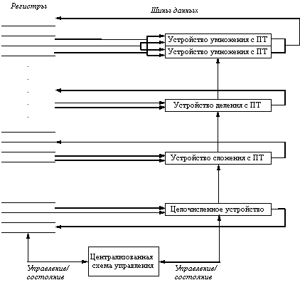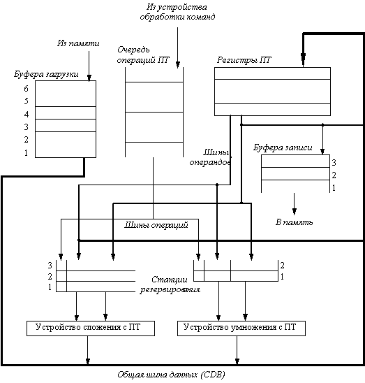 Рис. 6.4. Регистры состояния централизованной схемы управления Другой подход к динамическому планированию - алгоритм Томасуло Другой подход к параллельному выполнению команд при наличии конфликтов был использован в устройстве плавающей точки в машине IBM 360/91. Эта схема приписывается Р. Томасуло и названа его именем. Разработка IBM 360/91 была завершена спустя три года после выпуска CDC 6600, прежде чем кэш-память появилась в коммерческих машинах. Задачей IBM было достижение высокой производительности на операциях с плавающей точкой, используя набор команд и компиляторы, разработанные для всего семейства 360, а не только для приложений с интенсивным использованием плавающей точки. Архитектура 360 предусматривала только четыре регистра плавающей точки двойной точности, что ограничивало эффективность планирования кода компилятором. Этот факт был другой мотивацией подхода Томасуло. Наконец, машина IBM 360/91 имела большое время обращения к памяти и большие задержки выполнения операций плавающей точки, преодолеть которые и был призван разработанный Томасуло алгоритм. В конце раздела мы увидим, что алгоритм Томасуло может также поддерживать совмещенное выполнение нескольких итераций цикла. Мы поясним этот алгоритма на примере устройства ПТ. Основное различие между нашим конвейером ПТ и конвейером машины IBM/360 заключается в наличии в последней машине команд типа регистр-память. Поскольку алгоритм Томасуло использует функциональное устройство загрузки, не требуется значительных изменений, чтобы добавить режимы адресации регистр-память; основное добавление - другая шина. IBM 360/91 имела также конвейерные функциональные устройства, а не несколько функциональных устройств. Единственное отличие между ними заключается в том, что конвейерное функциональное устройство может начинать выполнение только одной операции в каждом такте. Поскольку реально отсутствуют фундаментальные отличия, мы описываем алгоритм, как если бы имели место несколько функциональных устройств. IBM 360/91 могла выполнять одновременно три операции сложения ПТ и две операции умножения ПТ. Кроме того, в процессе выполнения могли находиться до 6 операций загрузки ПТ, или обращений к памяти, и до трех операций записи ПТ. Для реализации этих функций использовались буфера данных загрузки и буфера данных записи. Хотя мы не будем обсуждать устройства загрузки и записи, необходимо добавить буфера для операндов. Схема Томасуло имеет много общего со схемой централизованного управления CDC 6600, однако имеются и существенные отличия. Во-первых, обнаружение конфликтов и управление выполнением являются распределенными - станции резервирования (reservation stations) в каждом функциональном устройстве определяют, когда команда может начать выполняться в данном функциональном устройстве. В CDC 6600 эта функция централизована. Во-вторых, результаты операций посылаются прямо в функциональные устройства, а не проходят через регистры. В IBM 360/91 имеется общая шина результатов операций (которая называется общей шиной данных (common data bus - CDB)), которая позволяет производить одновременную загрузку всех устройств, ожидающих операнда. CDC 6600 записывает результаты в регистры, за которые ожидающие функциональные устройства могут соперничать. Кроме того, CDC 6600 имеет несколько шин завершения операций (две в устройст