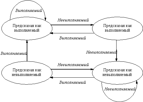 ![]() Рис. 6.8. Диаграмма состояния двухбитовой схемы прогнозирования Двухбитовая схема прогнозирования в действительности является частным случаем более общей схемы, которая в каждой строке буфера прогнозирования имеет n-битовый счетчик. Этот счетчик может принимать значения от 0 до 2n - 1. Тогда схема прогноза будет следующей: