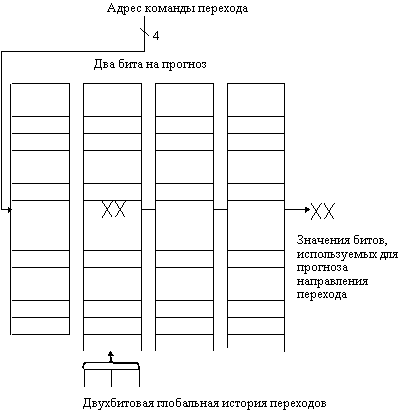 ![]() Рис. 6.9. Сравнение качества 2-битового прогноза Рассмотренные двухбитовые схемы прогнозирования используют информацию о недавнем поведении команды условного перехода для прогноза будущего поведения этой команды. Вероятно можно улучшить точность прогноза, если учитывать не только поведение того перехода, который мы пытаемся предсказать, но рассматривать также и недавнее поведение других команд перехода. Рассмотрим, например, небольшой фрагмент из текста программы eqntott тестового пакета SPEC92 (это наихудший случай для двухбитовой схемы прогноза): if (aa==2) aa=0; if (bb==2) bb=0; if (aa!=bb) { Ниже приведен текст сгенерированной программы (предполагается, что aa и bb размещены в регистрах R1 и R2): SUBI R3,R1,#2 BNEZ R3,L1 ; переход b1 (aa!=2) ADD R1,R0,R0 ; aa=0 L1: SUBI R3,R2,#2 BNEZ R3,L2 ; переход b2 (bb!=2) ADD R2,R0,R0 ; bb=0 L2: SUB R3,R1,R2 ; R3=aa-bb BEQZ R3,L3 ; branch b3 (aa==bb). ... L3: Пометим команды перехода как b1, b2 и b3. Можно заметить, что поведение перехода b3 коррелирует с переходами b1 и b2. Ясно, что если оба перехода b1 и b2 являются невыполняемыми (т.е. оба условия if оцениваются как истинные и обеим переменным aa и bb присвоено значение 0), то переход b3 будет выполняемым, поскольку aa и bb очевидно равны. Схема прогнозирования, которая для предсказания направления перехода использует только прошлое поведение того же перехода никогда этого не учтет. Схемы прогнозирования, которые для предсказания направления перехода используют поведение других команд перехода, называются коррелированными или двухуровневыми схемами прогнозирования. Схема прогнозирования называется прогнозом (1,1), если она использует поведение одного последнего перехода для выбора из пары однобитовых схем прогнозирования на каждый переход. В общем случае схема прогнозирования (m,n) использует поведение последних m переходов для выбора из 2m схем прогнозирования, каждая из которых представляет собой n-битовую схему прогнозирования для каждого отдельного перехода. Привлекательность такого типа коррелируемых схем прогнозирования переходов заключается в том, что они могут давать больший процент успешного прогнозирования, чем обычная двухбитовая схема, и требуют очень небольшого объема дополнительной аппаратуры. Простота аппаратной схемы определяется тем, что глобальная история последних m переходов может быть записана в m-битовом сдвиговом регистре, каждый разряд которого запоминает, был ли переход выполняемым или нет. Тогда буфер прогнозирования переходов может индексироваться конкатенацией (объединением) младших разрядов адреса перехода с m-битовой глобальной историей. Например, на рис. 6.10. показана схема прогнозирования (2,2) и организация выборки битов прогноза.
