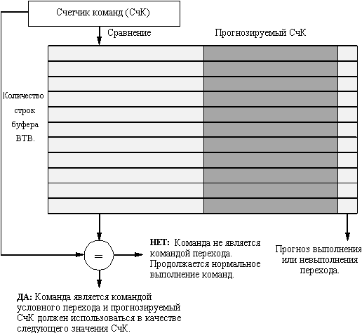 перехода = 1К. На рис. 6.9 представлены результаты для сравнения простой двухбитовой схемы прогнозирования с 4К строками и схемы прогнозирования (2,2) с 1К строками. Как можно видеть, эта последняя схема прогнозирования не только превосходит простую двухбитовую схему прогнозирования с тем же самым количеством бит состояния, но часто превосходит даже двухбитовую схему прогнозирования с неограниченным (бесконечным) количеством строк. Имеется широкий спектр корреляционных схем прогнозирования, среди которых схемы (0,2) и (2,2) являются наиболее интересными. Дальнейшее уменьшение приостановок по управлению: буфера целевых адресов переходов Рассмотрим ситуацию, при которой на стадии выборки команд находится команда перехода (на следующей стадии будет осуществляться ее дешифрация). Тогда чтобы сократить потери, необходимо знать, по какому адресу выбирать следующую команду. Это означает, что нам как-то надо выяснить, что еще недешифрированная команда в самом деле является командой перехода, и чему равно следующее значение счетчика адресов команд. Если все это мы будем знать, то потери на команду перехода могут быть сведены к нулю. Специальный аппаратный кэш прогнозирования переходов, который хранит прогнозируемый адрес следующей команды, называется буфером целевых адресов переходов (branch-target buffer). Каждая строка этого буфера включает программный адрес команды перехода, прогнозируемый адрес следующей команды и предысторию команды перехода (рис. 6.11). Биты предыстории представляют собой информацию о выполнении или невыполнении условий перехода данной команды в прошлом. Обращение к буферу целевых адресов перехода (сравнение с полями программных адресов команд перехода) производится с помощью текущего значения счетчика команд на этапе выборки очередной команды. Если обнаружено совпадение (попадание в терминах кэш-памяти), то по предыстории команды прогнозируется выполнение или невыполнение условий команды перехода, и немедленно производится выборка и дешифрация команд из прогнозируемой ветви программы. Считается, что предыстория перехода, содержащая информацию о двух предшествующих случаях выполнения этой команды, позволяет прогнозировать развитие событий с вполне достаточной вероятностью.