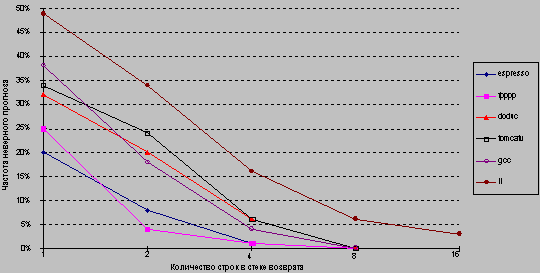 ![]() Рис. 6.11. Буфер целевых адресов переходов Существуют и некоторые вариации этого метода. Основной их смысл заключается в том, чтобы хранить в процессоре одну или несколько команд из прогнозируемой ветви перехода. Этот метод может применяться как в совокупности с буфером целевых адресов перехода, так и без него, и имеет два преимущества. Во-первых, он позволяет выполнять обращения к буферу целевых адресов перехода в течение более длительного времени, а не только в течение времени последовательной выборки команд. Это позволяет реализовать буфер большего объема. Во-вторых, буферизация самих целевых команд позволяет использовать дополнительный метод оптимизации, который называется свертыванием переходов (branch folding). Свертывание переходов может использоваться для реализации нулевого времени выполнения самих команд безусловного перехода, а в некоторых случаях и нулевого времени выполнения условных переходов. Рассмотрим буфер целевых адресов перехода, который буферизует команды из прогнозируемой ветви. Пусть к нему выполняется обращение по адресу команды безусловного перехода. Единственной задачей этой команды безусловного перехода является замена текущего значения счетчика команд. В этом случае, когда буфер адресов регистрирует попадание и показывает, что переход безусловный, конвейер просто может заменить команду, которая выбирается из кэш-памяти (это и есть сама команда безусловного перехода), на команду из буфера. В некоторых случаях таким образом удается убрать потери для команд условного перехода, если код условия установлен заранее. Еще одним методом уменьшения потерь на переходы является метод прогнозирования косвенных переходов, а именно переходов, адрес назначения которых меняется в процессе выполнения программы (в run-time). Компиляторы языков высокого уровня будут генерировать такие переходы для реализации косвенного вызова процедур, операторов select или case и вычисляемых операторов goto в Фортране. Однако подавляющее большинство косвенных переходов возникает в процессе выполнения программы при организации возврата из процедур. Например, для тестовых пакетов SPEC возвраты из процедур в среднем составляют 85% общего числа косвенных переходов. Хотя возвраты из процедур могут прогнозироваться с помощью буфера целевых адресов переходов, точность такого метода прогнозирования может оказаться низкой, если процедура вызывается из нескольких мест программы или вызовы процедуры из одного места программы не локализуются по времени. Чтобы преодолеть эту проблему, была предложена концепция небольшого буфера адресов возврата, работающего как стек. Эта структура кэширует последние адреса возврата: во время вызова процедуры адрес возврата вталкивается в стек, а во время возврата он оттуда извлекается. Если этот кэш достаточно большой (например, настолько большой, чтобы обеспечить максимальную глубину вложенности вызовов), он будет прекрасно прогнозировать возвраты. На рис. 6.12 показано исполнение такого буфера возвратов, содержащего от 1 до 16 строк (элементов) для нескольких тестов SPEC.
