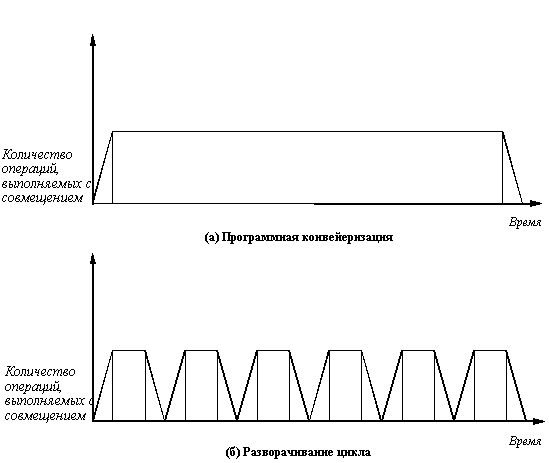 ![]() Рис. 6.15. Программная конвейеризация Например, рассмотрим программно конвейеризованную версию нижеприведенного цикла, который складывает с содержимым регистра F2 все элементы некоторого массива с начальным адресом, хранящимся в регистре R1. Loop: LD F0,0(R1) ADDD F4,F0,F2 SD 0(R1),F4 SUBI R1,R1,#8 BNEZ R1, Loop Игнорируя пролог и эпилог мы можем переписать цикл следующим образом: Loop: SD 0(R1),F4 ; записывает в M[i] ADDD F4,F0,F2 ; складывает с M[i-1] LD F0,-16(R1); загружает M[i-2] BNEZ R1, Loop SUBI R1,R1,#8 ; вычитает в слоте задержки Если не принимать во внимание пролог и эпилог, этот цикл может работать со скоростью 5 тактов на один проход. Поскольку команда загрузки осуществляет выборку на расстоянии двух элементов от счетчика цикла, цикл должен выполнять на две итерации меньше. При этом перед началом цикла из содержимого регистра R1 необходимо вычесть 16. Заметим, что повторное использование регистров (например, F4, F0 и R1) требует использования специальных аппаратных средств, чтобы обойти конфликты типа WAR и приостановки конвейера. В данном случае это не должно привести к каким-либо проблемам, поскольку никаких приостановок по причине зависимостей по данным произойти не должно. Управление регистрами в программно конвейеризуемых циклах может быть достаточно сложным. Вышеприведенный пример не слишком тяжелый, поскольку в регистры выполняется запись в одной итерации, а их чтение происходит в следующей. В других случаях может потребоваться увеличить количество итераций между моментом выдачи команды и моментом, когда используется ее результат. Это происходит, когда в теле цикла имеется небольшое количество команд, а задержки их выполнения достаточно большие. В этих случаях требуется комбинация методов программной конвейеризации и разворачивания цикла. Программную конвейеризацию можно рассматривать как символическое разворачивание цикла. Действительно, некоторые алгоритмы программной конвейеризации используют разворачивание цикла в качестве исходного материала для расчета (вычисления) выполнения программной конвейеризации. Главное преимущество программной конвейеризации по отношению к прямому разворачиванию циклов заключается в том, что первая генерирует в результате меньший по размеру программный код. Программная конвейеризация и разворачивание циклов в дополнение к тому, что они дают лучше спланированный внутренний цикл, сами по себе сокращают разные типы накладных расходов. Разворачивание циклов сокращает накладные расходы на организацию цикла, связанные с командами перехода и изменения значения счетчика циклов. Программная конвейеризация сокращает время, когда цикл не работает с полной скоростью, что происходит только однажды в начале и в конце цикла. Если мы разворачиваем цикл, который выполняет 100 итераций постоянное количество раз, скажем 4 раза, мы будем иметь накладные расходы 100/4=25 раз - каждый раз, когда будет инициироваться внутренний развернутый цикл. На рис. 6.16 это поведение показано графически. Поскольку эти методы направлены на два различных типа накладных расходов, наилучший результат может быть получен при использовании обоих методов. Другим методом, используемым для выделения дополнительного параллелизма, является трассировочное планирование. Трассировочное планирование расширяет метод разворачивания циклов методикой для нахождения параллели