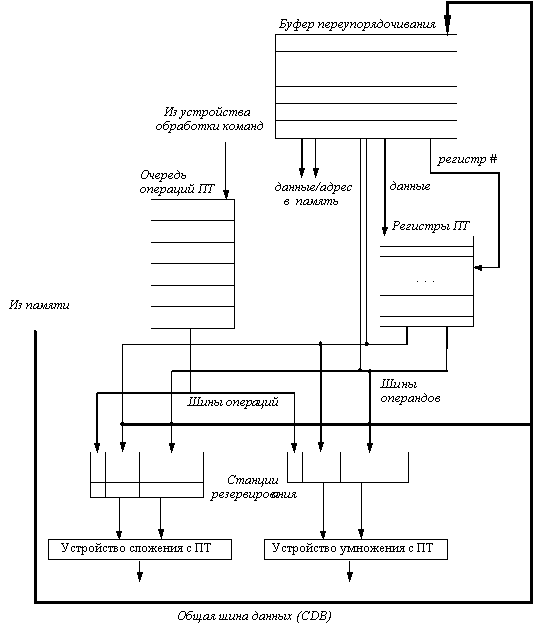Рис. 6.20. Состояние устройства ПТ для выполнения по предположению Исключительные ситуации в подобной машине не воспринимаются до тех пор, пока соответствующая команда не готова к фиксации. Если выполняемая по предположению команда вызывает исключительную ситуацию, эта исключительная ситуация записывается в буфер упорядочивания. Если обнаруживается неправильный прогноз направления условного перехода и выясняется, что команда не должна была выполняться, исключительная ситуация гасится вместе с командой, когда обнуляется буфер переупорядочивания. Если же команда достигает вершины буфера переупорядочивания, то мы знаем, что она более не является выполняемой по предположению (она уже стала безусловной), и исключительная ситуация должна действительно восприниматься. Эту методику выполнения по предположению легко распространить и на целочисленные регистры и функциональные устройства. Действительно, выполнение по предположению может быть более полезно в целочисленных программах, поскольку именно такие программы имеют менее предсказуемое поведение переходов. Кроме того, эти методы могут быть расширены так, чтобы обеспечить работу в машинах с выдачей на выполнение и фиксацией результатов нескольких команд в каждом такте. Выполнение по предположению возможно является наиболее интересным методом именно для таких машин, поскольку менее амбициозные машины могут довольствоваться параллелизмом уровня команд внутри базовых блоков при соответствующей поддержке со стороны компилятора, использующего технологию разворачивания циклов. Очевидно, все рассмотренные ранее методы не могут достичь большей степени распараллеливания, чем заложено в конкретной прикладной программе. Вопрос увеличения степени параллелизма прикладных систем в настоящее время является предметом интенсивных исследований, проводимых во всем мире. | |||||||||||||||||||||||||||||||||||||||||||||||||||||||||||||||||||||||||||||||||||||||||||||||||||||||||||||||||||||||||||||||||||||||||||||||||||||||||||||||||||||||||||||||||||||||||||||||||||||||||||||||||||||||||||||||||||||||||||||||||||||||||||||||||||||||||||||||||||||||||||||||||||||||||||||||||||||||||||||||||||||||||||||||||||||||||||||||||||||||||||||||||||||||||||||||||||||||||||||||||||||||||||||||||||||||||||||||||||||||||||||||||||||||||||||||||||||||||||||||||||||||||||||||||||||||||||||||||||||||||||||||||||||||||||||||||||||||||||||||||||||||||||||||||||||||||||||||||||||||||||||||||||||||||||||||||||||||||||||||||||||||||||||||||||||||||||||||||||||||||||||||||||||||||||||||||||||||||||||||||||||||||||||||||||||||||||||||||||||||||||||||||||||||||||||||||||||||||||||||||||||||||||||||||||||||||||||||||||||||||||||||||||||||||||||||||||||||||||||||||||||||||||||||||||||||||||||||||||||||||||||||||||||||||||||||||||||||||||||||||||||||||||||||||||||||||||||||||||||||