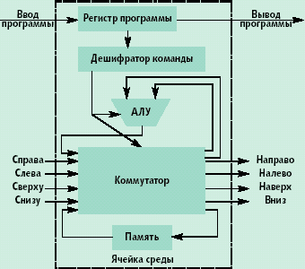 В режиме «работа» ячейка выполняет команды над операндами, поступающими из информационных каналов или из внутренней, как правило, однобитной памяти. То, какие операнды использовать, и какую операцию выполнять над ними определяется дешифратором команды, который управляет АЛУ и коммутатором ячейки. Эта же команда определяет, на какие информационные выходы, и что надо выдавать из ячейки. Ячейка, как правило, выполняет следующие команды: транзит данных через ячейку с ее входов с записью или без записи в память ячейки; нет операции; суммирование с учетом или без учета переноса; логическая операция (суммирование по модулю 2, или, и, не-и); генерирование константы. Настройка ячеек может быть статической или динамической. В первом случае команды в регистр программы записываются извне. Во втором случае должен предусматриваться способ, как будет выполняться конфигурирование ячеек (т.е. выполняться загрузка регистров программы ячеек). Ячейки могут двояко воспринимать входную информацию. Когда ячейка формирует выходные сигналы сообразно с конфигурацией, она работает в «комбинационном» режиме или режиме обработки данных, как комбинационный логический блок. Может быть введен дополнительный режим работы ячейки, называемый «режимом модификации», позволяющий интерпретировать входные данные как новое содержимое регистра программы. Ячейки входят в этот режим и выходят из него через скоординированный обмен с соседними ячейками. Во время этого скоординированного обмена соседняя ячейка предоставляет новую программу (таблицу истинности) для модифицируемой ячейки. Конфигурирование ячейки является чисто локальной операцией, в которой участвуют только две ячейки — та, которая имеет новое содержимое, и та, в которую это содержимое записывается. Благодаря локальности, операции конфигурирования могут производиться одновременно во множестве различных областей матрицы ячеек. Любая из ячеек матрицы может работать в любом из данных режимов. Не существует ячеек с заранее предопределенным режимом работы, он определяется данными от соседних ячеек на входах этой ячейки. В типовой сложной схеме матрица содержит ячейки, которые обрабатывают данные, и ячейки, которые участвуют в реконфигурации других ячеек. Функционирование системы включает тесную кооперацию, взаимодействие, обмен между комбинационными узлами и узлами модификации. Можно не только обрабатывать данные на наборе ячеек, но и заставлять ячейки считывать и записывать конфигурацию других ячеек, что позволяет создавать динамические самоконфигурируемые системы, чье поведение во время выполнения может изменяться в зависимости от локальных событий. Литература
