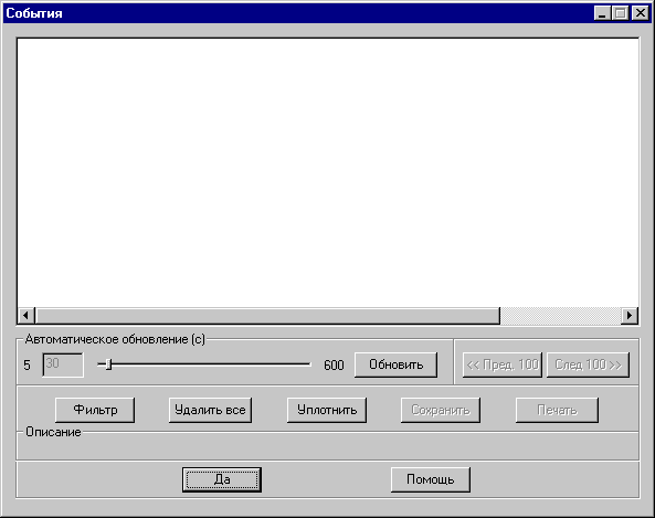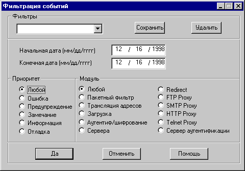 Модуль: Эта опция позволяет увидеть сообщения, которые генерируются каким-либо из трех главных модулей системы или любым внешним сервером. При выборе конкретного модуля будут показаны только относящиеся к нему сообщения. Кнопка Да накладывает описанный фильтр и открывает окно событий с выборкой соответствующей фильтру информации. Кнопка Отменить отменяет операцию фильтрации и в полях окна событий появляется предыдущая информация. Кнопка Помощь выводит окно подсказки по данному разделу.