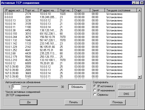 Окно активных соединений