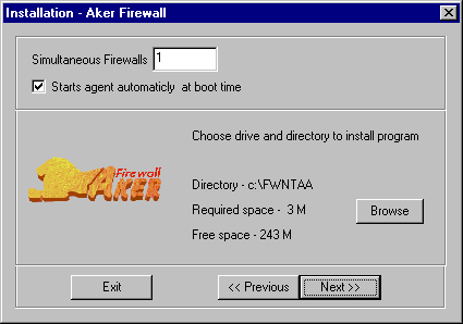 15-3 Установка агента аутентификации в Windows NTУстановка агента аутентификации в Windows NT очень проста. Для этого нужно смонтировать CD диск Aker Firewall 3.01 на хосте назначения или скопировать содержимое каталога с инсталлированным агентом из CD в какой-либо временный каталог в этом хосте. Затем надо нажать меню Start, выделить в нем оцию Run и ввести с клавиатуры в поле Open следующую команду: D:\agent\NT\install (если CD диск смонтирован на устройство, отличное от D, замените D соответствующей буквой). Программа сначала откроет окно, в котором следует подтвердить необходимость инсталляции. Для этого на вопрос о продолжении инсталляции надо ответить Yes. В этом случае появится следующее окно: Окно параметров инсталляции агента для Windows NT