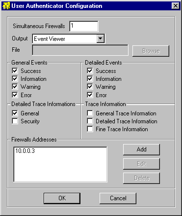 В поле Simultaneous firewalls нужно ввести число межсетевых экранов, которые будут одновременно использовать аутентификатор (это число отлично от 1 только в случае, если число межсетевых экранов в сети, которые используют для аутентификации одного и того же агента, больше 1). Опция Start agent automatically on boot позволяет автоматически запускать агента при каждом перезапуске хоста. Если эта опция установлена, агент должен запускаться вручную. После заполнения всех значений необходимо нажать кнопку Next. Процедура инсталляции включает следующие действия: создание каталога с файлами агента и именем fwntaa, создание группы под названием Aker Firewall с опциями для настройки и удаления агента, и создание сервиса, называемого Aker Firewall Authentication agent. Этот сервис является обычным сервисом Windows NT, его можно остановить или запустить через Control Panal , опция сервисы. Агент аутентификации слушает запросы на порту 1021/TCP. Во время работы агента не должно быть других приложений, использующих этот порт. Настройка агента аутентификации для NTПосле инсталляции агента необходимо продолжить его настройку. Она позволяет зарегистрировать все межсетевые экраны, которые будут использовать агент, а также определить сообщения, генерируемые агентом при работе. В отличие от агента аутентификации для Unix, эти настройки выполняются с помощью отдельной программы. Для доступа к программе намтройки необходимо нажать меню Start, выбрать группу Aker Firewall, а затем внутри группы выделить опцию Configure authentication agent. После выполнения этих действий откроется следующее окно: