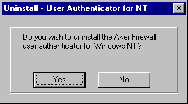 Это окно содержит все опции для настройки агента. В верхней части окна размещаются опции, позволяющие выбрать тип сообщений, генерируемых агентом, и куда они должны посылаться. Поле Output определяет, куда будут посылаться сообщения: в Event Viewer системы Windows NT и/или в файл. В случае файла его имя нужно ввести в поле File. Под этими полями размещены несколько опций для описания сообщений. Для генерации определенного типа сообщения нужно, чтобы соответствующая опция была установлена. Можно посылать сообщения в файл и в Event Viewer одновременно, для этого достаточно, чтобы были установлены обе опции и определено имя файлв для вывода. Под списком типов сообщений помещен список адресов межсетевых экранов, имеющих право использовать агента для аутентификации, а также пароли доступа каждого из них. Чтобы добавить новый сервер, нажмите кнопку Add. Откроется окно, в которое следует ввести IP адрес и пароль межсетевого экрана. Для изменения пароля зарегистрированного межсетевого экрана, достаточно выделить его адрес и нажать кнопку Edit. Откроется окно с соответствующим полем. Для удаления межсетевого экрана из списка выделите его адрес и нажмите кнопку Delete. После проведения модификаций нажмите кнопку OK, которая закрывает окно и сохраняет опции . При изменении в списка межсетевых экранов при запущенном агенте, необходимо остановить его и запустить снова. Это можно сделать через Control Panel. Удаление агента аутентификации для NTДля упрощения процесса удаления агента аутентификации существует утилита, которая делает это автоматически. Для ее запуска нажмите меню Start, выделите группу Aker Firewall, и в этой группе опцию Remove authentication agent. Откроется следующее окно:
