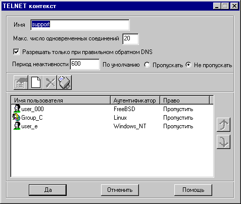 Окно контекстов содержит все Telnet контексты, определенные в межсетевом экране. Оно состоит из списка, в котором каждый контекст показан на отдельной строке.