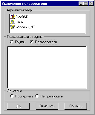 Окно добавления определяет полномочия на доступ для пользователя или группы у конкретного аутентификатора. Для его определения необходимо сделать следующее: