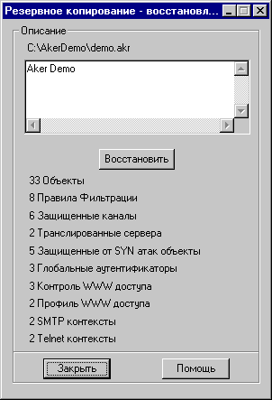 Это окно позволяет сделать описание сохраняемой резервной копии. Это описание представляет из себя текст, который может быть полезным при восстановлени с копии. После того как Вы сделаете описание, нажмите кнопку Сохранить, которая открывает окно, в котором можно указать название и путь к сохраняемому файла. Если сохранять копию не нужно, нажмите кнопку Закрыть. 20-2 Восстановление с резервной копииЭта опция позволяет восстановить с резервной копии полной конфигурации межетевого экрана. Для восстановления с резервной копии надо сделать следующее::