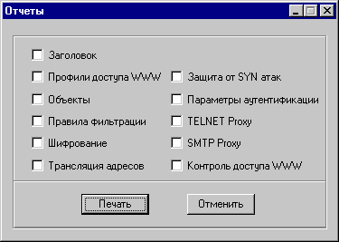 20-5 ОтчетыЭта опция дает возможность администратору легко и быстро печатать отчеты по всем настройкам (или их части) межсетевого экрана. Такие отчеты очень полезны для анализа параметров и их документирования. Для доступа к окну докладов сделайте следующее: