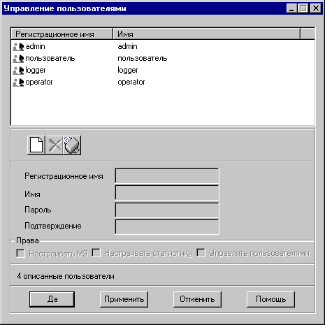 Этот экран содержит список всех зарегистрированных пользователей. По каждому пользователю показываются учетное и полное имена. Полное число пользователей приводится в нижней части экрана
