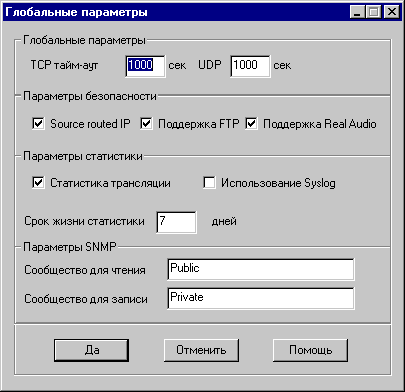 Статистика трансляции: Включает статистику трансляции сетевых адресов Значение по умолчанию: Статистика по трансляции не будет собираться Даже при активизации этой опции будут регистрироваться только пакеты, преобразованные при трансляции адресов клиентских программ. Статистика трансляции адресов серверов фиксироваться не будет. Включение этой опции носит информативный характер, ее можно использовать только для тестирования или отладки. Использование Syslog: Включает отправку статистики через демон syslogd. Значение по умолчанию: Статистика не отправляется через syslogd При выборе этой опции статистика будет отсылаться через local0 facility, а записи о событиях через local1 facility Эта опция не меняет внутреннего механизма сбора статистики и сообщений межсетевого экрана. Срок жизни статистики: Статистика, которую фиксирует межсетевой экран, хранится в циклически обновляемых файлах, и таким образом новые элементы можно добавлять поверх старых. Этот параметр определяет минимальное число дней, в течение которых записи статистики или событий должны храниться в файле без замены. Допустимые значения этой величины составляют от 1 до 30000 дней. Значение по умолчанию: 7 дней Этот параметр действителен только для внутренней статистики межсетевого экрана, он не действует для записей, посылаемых через syslogd.