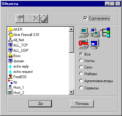 В межсетевом экране Aker существуют 5 различных типов объектов: хосты, сети, наборы, сервисы и аутентификаторы.