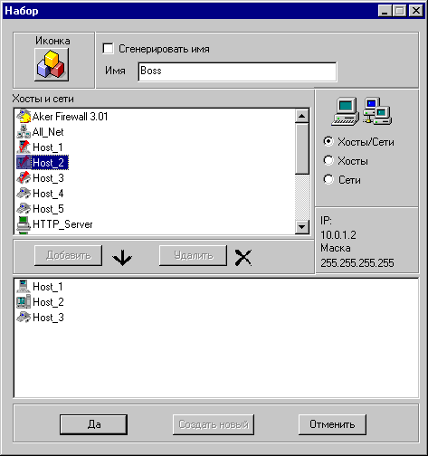 - В правой стороне окна расположены два значка представляющие два типа объектов, которые можно добавить к набору - хосты и сети. Справа под значками помещается список, в котором можно выделить, следует ли показать на дисплее только хосты или только сети, или сразу оба объекта.