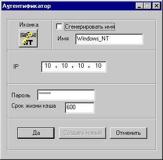 Иконка: Это иконка, которая будет ассоциироваться с аутентификатором. Для ее модификации надо нажать на графическое изображение значка. Тогда межсетевой экран покажет список всех возможных значков, представляющих аутентификаторы. Для выделения одного из них нужно нажать на его изображение и кнопку Да. Если вы не хотите модифицировать значок, то после просмотра списка достаточно нажать кнопку Отменить.