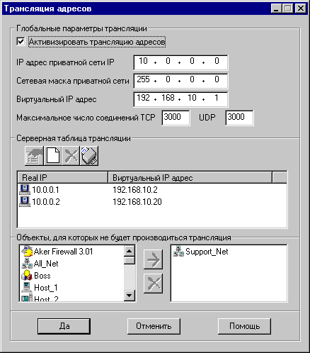 Объекты, для которых трансляция производиться не будетТаблица объектов, для которых трансляция не будет производиться используется для задания хостов, сетей и наборов, приватные адреса которых не будут транслироваться. В этом случае, даже если хост описан в серверной таблице, его адрес источника не будет транслироваться при обращении к объектам, описанным в этой таблице В этой таблице два списка: в левом представлены все описанные в системе объекты типа хост, сеть, набор. Справа представлены те обьекты, для которых трансляция производиться не будет. Для добавления объекта к таблице исключений необходимо