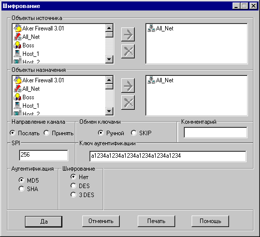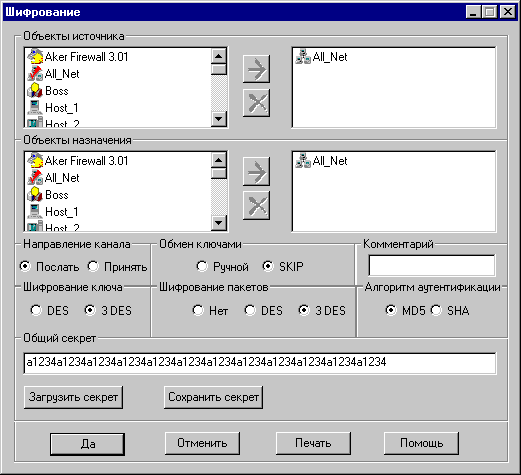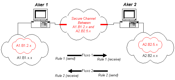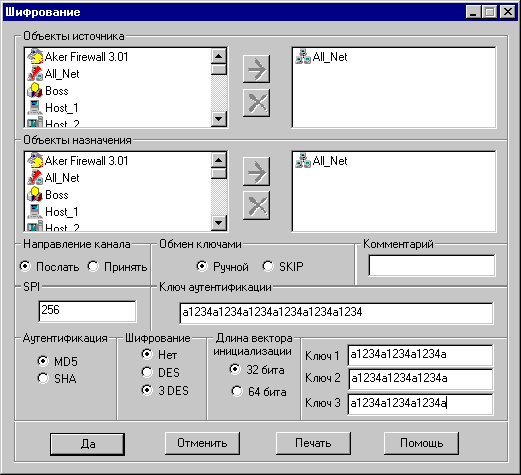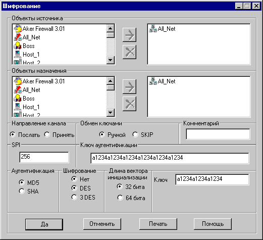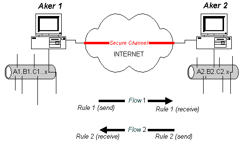 Опишем сценарий в общих чертах: для установления связи генерируется случайный ключ и он используется для зашифрования и аутентификации посылаемых данных. Затем этот ключ шифруется на мастер ключе и отсылается вместе с зашифрованными данными. Когда принимающая сторона получает пакет, она расшифровывает ключ с помощью мастер ключа и использует его для расшифровки остального пакета. Основным преимуществом SKIP является возможность использовнияя одного и того же секрета годами, не боясь его взлома нарушителем (поскольку замена ключа производится с интервалом от нескольких секунд до максимального значения в один час, в зависимости от трафика между взаимодействующими сетями). Настоятельно рекомендуется пользоваться этой опцией при конфигурировании защищенных каналов. Определение защищенных каналовДля определения защищенного канала сначала надо выбрать две группы хостов, которые будут обмениваться информацией защищенным образом. Эти группы хостов будут обмениваться подписанными и при необходимости зашифрованными пакетами. На каждом конце канала нужно установить межсетевые экраны, которые будут осуществлять аутентификацию/верификацию и шифрование/дешифрование передаваемых данных. Для определения групп хостов используется концепция объектов, рассмотренная в главе 5 Регистрация объектов. При определении канала можно пользоваться обектами типа "хост", "сеть" или "набор". Кроме объектов, необходимо определить алгоритм аутентификации, и в случае необходимости, криптографический алгоритм. Ключи аутентификации и шифрования завершают перечень параметров, необходимых для описания канала. Межсетевой экран Aker поддерживает несколько одновременно защищенных каналов между различными точками. На межсетевом экране содержится список, каждый элемент которого полностью определяет параметры защищенного канала. Этот элемент называется Security Association или SA. Планирование защищенных каналов должно проводиться очень тщательно. Использование криптографии отнимает много вычислительных ресурсов. Поэтому шифрование пакетов, если это не диктуется интересами безопасности, представляется напрасной тратой ресурсов. Более того, разные алгоритмы шифрования требуют различного объема обработки, и обеспечивают различные уровни безопасности. Каждый алгоритм следует выбирать в зависимости от необходимого уровня безопасности (выше было дано описание всех алгоритмов, поддерживаемых межсетевым экраном Aker). Последнее замечание по поводу защищенных каналов касается их одностороннего характера, т.е. если вы хотите настроить защищенную связь между двумя сетями А и В, то должны настроить два разных канала: канал с источником в сети А и пунктом назначения в сети В и другой канал с источником в сети В и пунктом назначения в сети А. Пакеты, посланные из А в В будут использовать настройки первого канала, а пакеты, посланные из В в А - второго. Это свойство подробнее будет проиллюстрировано в приведенных ниже примерах: Примеры использования защищенных каналовГлавный пример настройки защищенного канала. В этом примере рассматривается, как описать защищенный канал связи между двумя сетями, взаимодействующими через Интернет, используя два межсетевых экрана Aker. Канал обеспечивает защиту всего трафика между этими двумя сетями. В качестве алгоритма а