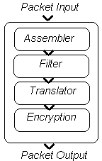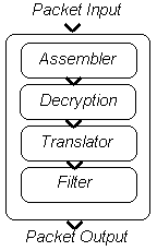 Этот модуль получает пакет с преобразованным адресом и решает в соответствии со своей конфигурацией, следует ли производить шифрование или аутентификацию пакета перед его отправкой в пункт назначения. При положительном решении будет проведена аутентификация пакета, он будет зашифрован и к нему будут добавлены некоторые специальные заголовки. Поток снаружи внутрьКогда пакет, приходящий из внешней сети во внутреннюю, достигает межсетевого экрана, он проходит через его модули в следующем порядке: модуль сборки, криптографический модуль, транслятор сетевых адресов и пакетный фильтр.