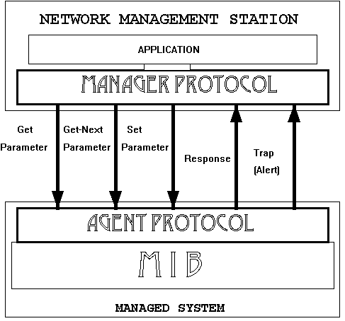 Как уже было сказано, каждое сетевое устройство содержит в себе информацию, необходимую для управления им. Эта информация некоторым образом размещена в регистрах устройства. Как же обеспечивается доступ к этой информации некоторой сетевой рабочей станции, выполняющей задачу управления сетью? Для обработки запросов управляющей станции, приходящих в виде SNMP пакетов, служит специальный модуль, называемый Агентом Управления. Агент принимает SNMP пакеты и выполняет соответствующие им действия, т.е. посылает значение запрашиваемой переменной, устанавливает значение переменных, выполняет периодическое обновление информации MIB, выполняет в ответ на установку соответствующих переменных некоторые операции. В роли Управляющей Станции может выступать рабочая станция администратора сети, если на ней запустить какой-либо пакет управления, поддерживающий протокол SNMP. Он позволяет администратору получать конкретную информацию о какой либо стороне функционирования элементов сети, например на уровне карты Ethernet, либо протокола EGP.