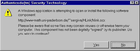 Рисунок 1. Этот орган управления не подписан. Что одержит верх - любопытство или осторожность? Подобную систему безопасности, конечно же, есть за что покритиковать. Прежде всего, невозможность подделать электронную подпись - это, если можно так выразиться, невозможность гораздо меньшего порядка, чем неспособность Java-апплета выпрыгнуть из своей виртуальной машины. Можно не сомневаться, что множество предприимчивых компьютерных взломщиков уже засели за решение этой задачи. Однако, на мой взгляд, гораздо хуже то, что эта система лишает возможности попробовать свои силы в программировании собственных органов управления множество мелких фирм и программистов-любителей - никому не известные, они смогут похвастаться своими безродными творениями разве что перед друзьями. Справедливость, однако, требует признать, что система ActiveX и реализованный в ней механизм безопасности кое в чем заметно удобнее использования языка Java. Во-первых, отсутствие защитной оболочки виртуальной машины позволяет расширить функциональность компонентов ActiveX - им доступен такой прямой и эффективный контроль над компьютером, о котором Java-апплеты не могут и мечтать. Но главный плюс технологии ActiveX, благодаря которому она так резко стартовала и так быстро завоевала признание, - это то, что программистам, желающим заняться разработкой компонентов ActiveX, почти не приходится переучиваться. OCX-модули впервые появились вместе с версией 4.0 языка Visual Basic и очень многое унаследовали от еще более старого стандарта VBX ("Visual Basic Controls"). Именно органы управления VBX в свое время и стимулировали развитие целой индустрии программных модулей, которые любой программист может купить и использовать в своих разработках. Переделать же OCX-модуль в компонент ActiveX даже проще, чем старый VBX в OCX. Более того - в броузере Internet Explorer технология ActiveX является не одним из усовершенствований, а буквально фундаментом всей программы. При запуске броузера управление получает миниатюрный контейнер, сразу же вызывающий специальный OCX-модуль, - в котором, собственно, и заключены все функции броузера. Любой программист может, таким образом, без труда встроить в свою программу полнофункциональный броузер WWW, написав всего лишь небольшую функцию для вызова этого модуля и обмена данными с ним. Отдельные функциональные блоки броузера - виртуальная машина Java, интерпретатор HTML и даже сам блок взаимодействия с органами управления ActiveX, - все они реализованы в виде OCX-модулей. Как заметил один программист, "Похоже, ребята в Microsoft сейчас только тем и занимаются, что берут все свои программы по очереди и распиливают их на OLE-компоненты". СинтаксисТе, кому уже сейчас не терпится посмотреть на настоящие живые компоненты ActiveX, могут, вооружившись броузером Internet Explorer, познакомиться с небольшой коллекцией органов управления ActiveX, отобранных фирмой Microsoft (если вы почему-либо не хотите расставаться с броузером Netscape, вам придется сначала установить для него специальный модуль, о котором речь пойдет ниже). Если же вам интереснее разобраться сначала в том, как использовать это новое средство в ваших собственных страницах, - читайте дальше. Органы управления ActiveX подключаются к HTML-документам с помощью тега <OBJECT>, который предложен в одном из рабочих стандартов Консорциума W3 и поддерживается пока только броузером Internet Explorer. Наз