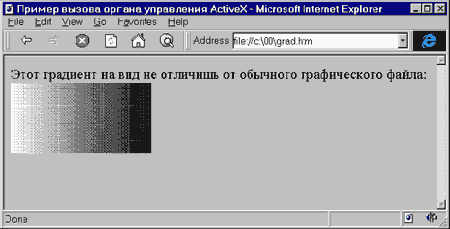 Рисунок 2. Пример вызова органа управления ActiveX Конечно, для простого статичного градиента вполне можно было бы обойтись обычным gif-файлом, не прибегая к ActiveX. Главное преимущество органов управления - это их интерактивность и возможность динамически изменять их параметры. Давайте попробуем оживить наш градиент, а заодно попрактикуемся в организации взаимодействия между органами управления и сценариями. Выделим на странице небольшую квадратную область и заполним ее градиентом типа "от центра к краям". Цвет краев выберем серым, а цвет центра будем динамически менять из черного в белый и обратно, создавая эффект "мигающей лампочки". Вызов градиента в этом примере запишем так: