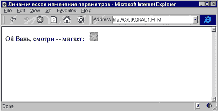 Как видно из этого примера, свойство EndColor может задаваться и изменяться как с помощью тега <PARAM> при создании объекта, так и впоследствии из сценария. Метод Repaint (хоть он и не указан в документации) имеется у всех органов управления, которые хоть что-нибудь рисуют на экране. Итак, периодическое изменение и перерисовку градиента (объект grad1) с частотой два раза в секунду обеспечивает таймер (объект timer1). Теперь наш градиент будет мигать до тех пор, пока мы не уйдем с этой страницы; на прорисовку остальных частей страницы, ее прокрутку и просмотр это практически не влияет. Снимок окна броузера с этой страницей приведен на рис. 3.