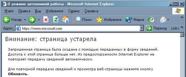Кеширование повышает скорость, с которой браузер показывает страницы. Почему же тогда сервер может попросить браузер не кешировать страницы? Представьте себе страницу, которая, например, показывает текущее время. Если браузер покажет эту страницу, взяв ее из кеша, то, разумеется, время на странице будет показано неправильно. Существует индустриальный стандарт - rfc 2616 ftp://ftp.rfc-editor.org/in-notes/rfc2616.txt, который определяет, как производители браузеров должны реализовывать функциональность, в том числе и функциональность кнопки "Back". Функциональность кнопки "Refresh" не очерчена в спецификации прямо, но к ней имеют отношение разделы, посвященные кешированию (Параграфы 13.1 – 13.12 ). При нажатии кнопки "Back" браузер должен показывать в точности ту страницу, которую пользователь уже просматривал ранее (rfc 2616, параграф 13.13) . Согласно спецификации, браузер в ответ на нажатие кнопки "Back" не должен делать запрос к скрипту, а вместо этого должен показать пользователю страницу, которую браузер "запомнил" в кеш-памяти. В таких случаях, страница, которую пользователь увидел по нажатию кнопки "Back", будет не такой, какую ему выдал бы скрипт с сервера. Это означает, что она будет содержать устаревшую информацию, которая может ввести пользователя в заблуждение. В ситуации, описанной выше, согласно rfc 2616, браузер должен предупредить пользователя. Internet Explorer 6 показывает в таких случаях следующий текст:
